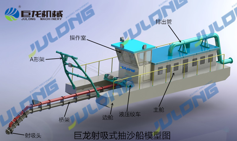 射吸式挖泥船工作原理:射吸式挖泥船依靠挖泥船上安裝的離心式泥泵的作用,在挖泥船吸管中產(chǎn)生一定的真空度,經(jīng)吸入管頂端的吸泥頭將水底淤泥、砂和其它比較松散的物質(zhì)與水一起吸起,經(jīng)泥泵的排除管,將泥漿排駁或輸送到排泥場。挖泥船在水庫清淤中,為了增加吸泥效果,又在吸入管頂端前部增加了噴射使得泥漿濃度提高,提高了挖泥船生產(chǎn)效率。該型挖泥船只適用于吸取水下砂質(zhì)和無粘性的土質(zhì),以及較松軟易于流動的泥漿,故該挖泥船多用于道的維護性疏浚及河口的維護性清淤。
